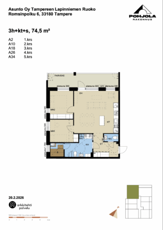 Arvioitu rahoitusvastike vuoden ajan 634,26 EUR/kk sisältää lainan korot (ei lainan lyhennystä). Arvioitu rahoitusvastike tulee olemaan vuoden jälkeen valmistumisesta 1432,20 EUR/kk sisältää lainan koron ja lainan lyhennykset. Arvioitu tontinlunastushinta on tämän asunnon osalta 59 871,00 EUR (lunastuksen jälkeen ei peritä tontinvuokravastiketta, joka tämän asunnon osalta on 279,38 EUR/kk). Yhtiö tulee keräämään lyhennyksen osuutta pääomavastikkeessa (koron lisäksi) viimeistään puoli vuotta ennen ensimmäisen lyhennyksen määräpäivää, jotta lyhennyksen osuus on yhtiön käytettävissä lyhennyksen eräpäivänä. Vesimaksu 25,00 EUR / kk / hlö on ennakkomaksua, joka tasataan omaa kulutusta vastaavaksi asunnon mittarilukemaan perustuen. €